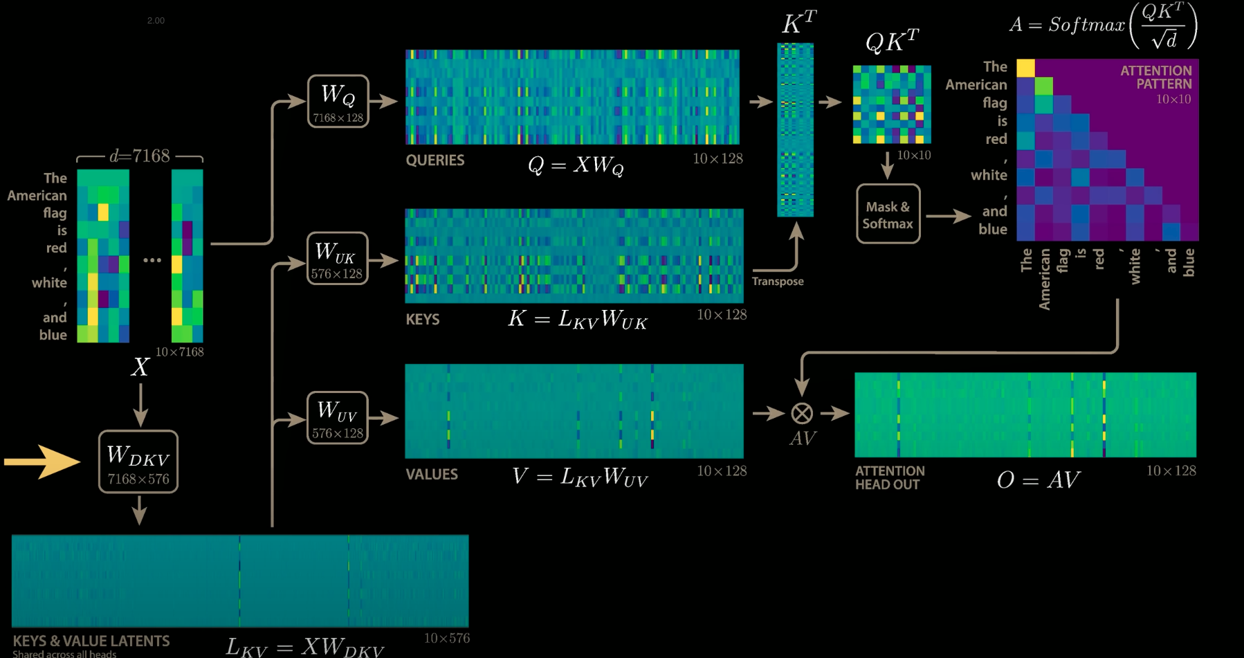 7. Compute Values Matrix: The same updated latent KV cache (CKV) is multiplied by the WUV matrix (Weight for Up-projection of Values) as in (iv). This WUV matrix is also fixed after pre-training. This yields the Values matrix for the entire sequence.