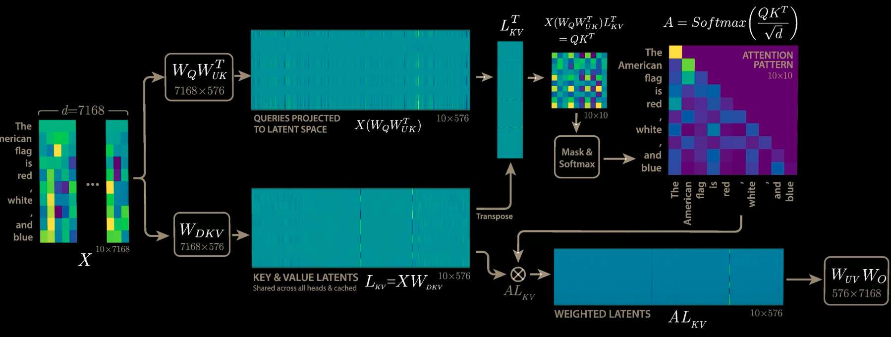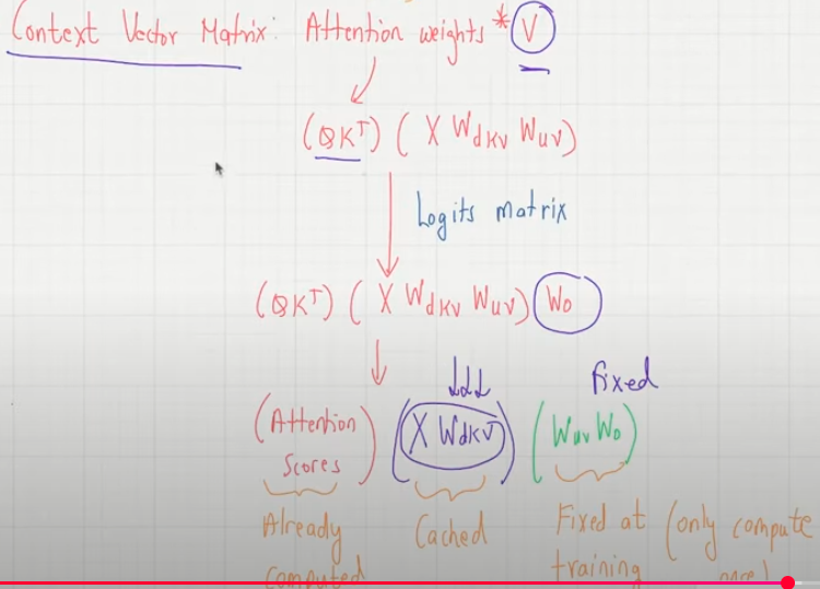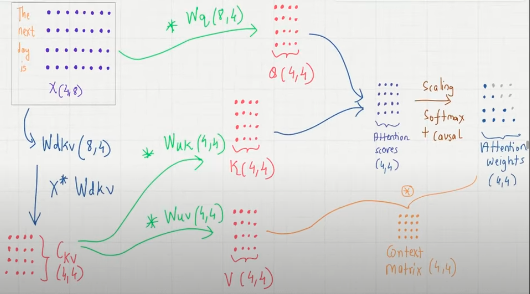 Input X becomes latent matrix Ckv (X * Wdkv) (iii) - This is only the cached part