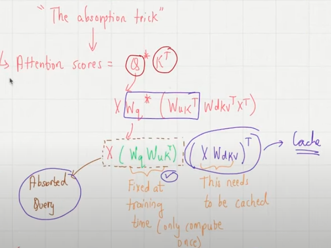 2. Compute Absorbed Query: The input embedding for the new token is multiplied by a pre-computed, fixed matrix which is the result of WQ multiplied by WUK^T. This matrix WQ * WUK^T) is calculated once during pre-training and is not cached. The result is the "absorbed query vector" for the new token.