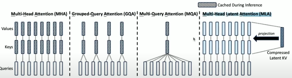 Before MHLA, the main approaches to reduce KV Cache memory were Multi-Query Attention (MQA) and Grouped-Query Attention (GQA).